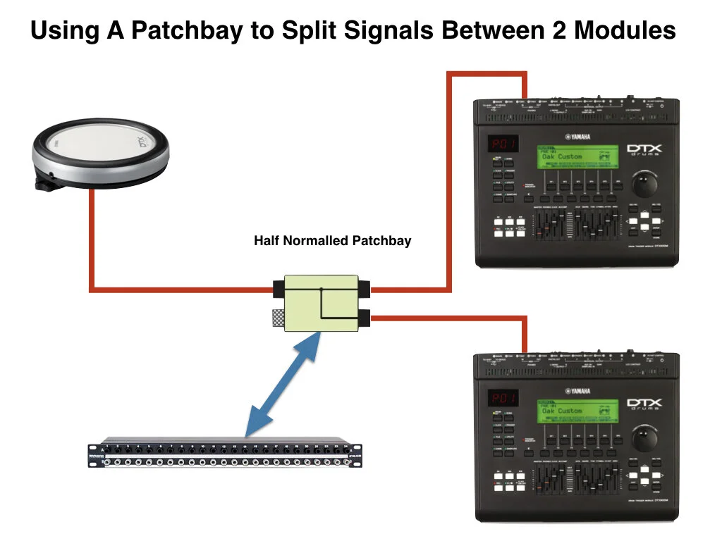 The bit which confuses most people is how to wire up the two modules. This actually couldn't be easier and it uses a patchbay (£30 upwards from eBay) like you'd find in a studio. Patchbays have a 'half normalled mode' that allows you to split one input to two outputs. If you connect one set of outputs to your main module and the other set to the second 'backup' module, you will be able to trigger both at the same time from one pad input. Then, if your main module dies, mid gig, you just raise the volume of the second module, turn down the main module, and you carry on. Simple and it takes under five seconds to change.